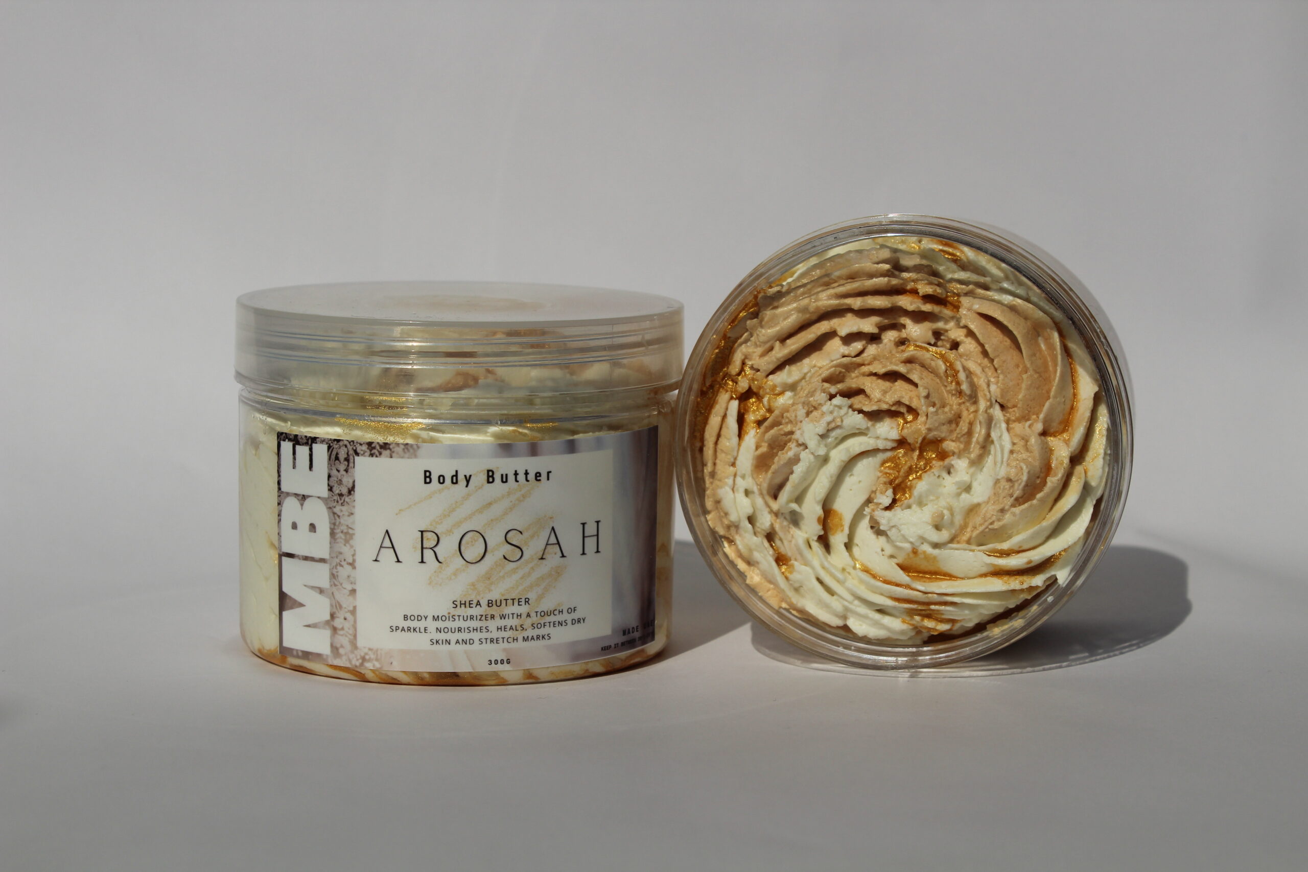 AROSAH Body Butter with Shea Butter. This luxurious body moisturizer, enriched with Shea Butter and a subtle touch of shimmer, is designed to deeply nourish and heal. Its advanced formula effectively softens dry skin and helps improve the appearance of stretch marks, leaving the skin radiant and healthily moisturized.
